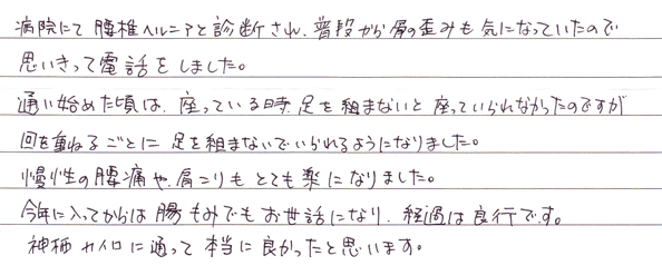 病院にて腰椎ヘルニアと診断され、普段から骨の歪みも気になっていたので思いきって電話をしました。通い始めた頃は、座っている時、足を組まないと座っていられなかったのですが、回を重ねるごとに足を組まないでいられるようになりました。慢性の腰痛や肩こりもとても楽になりました。今年に入ってからは、腸もみでもお世話になり、経過は良好です。神栖カイロに通って、本当に良かったと思います。